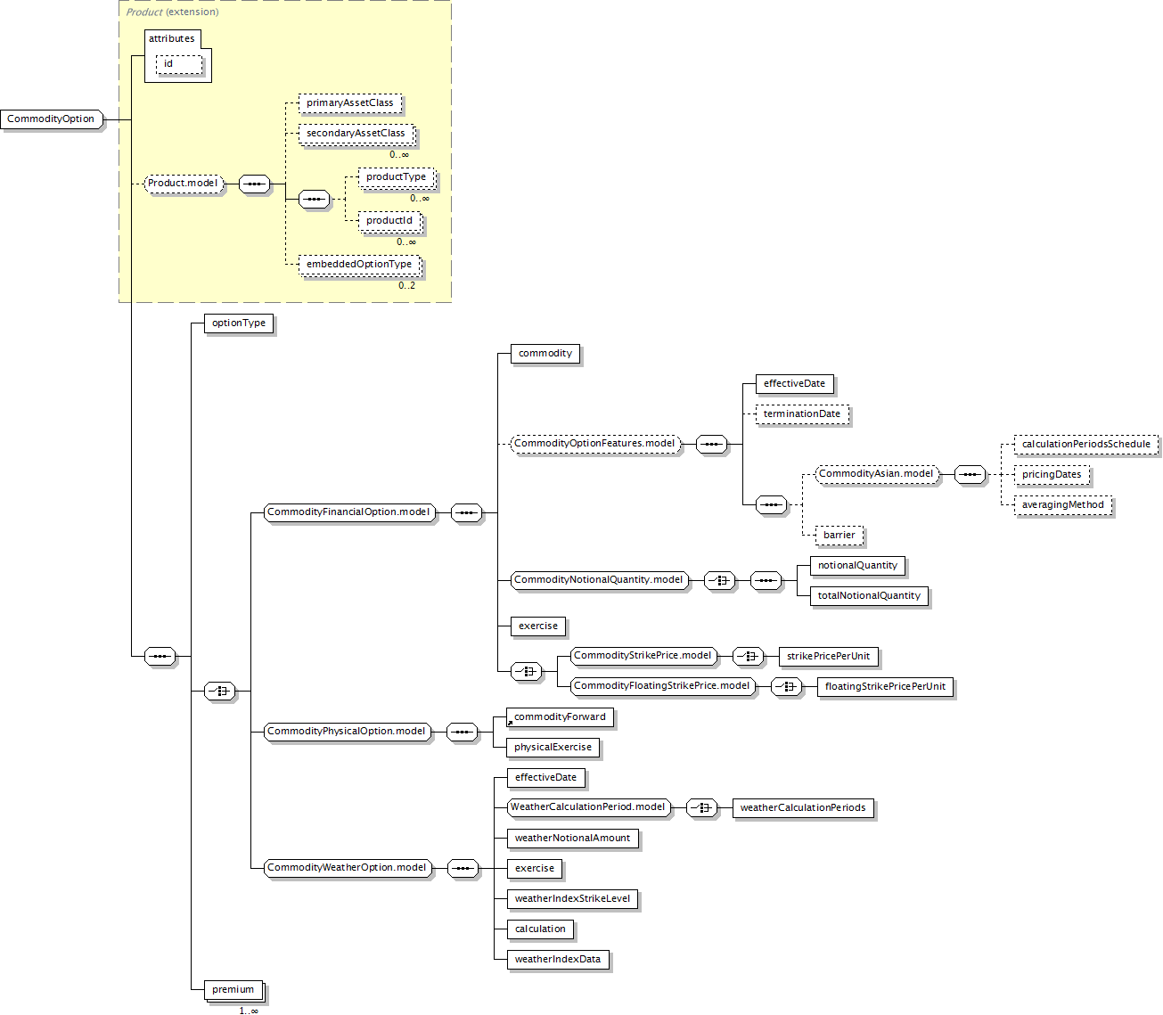 ( primaryAssetClass?, secondaryAssetClass*, productType*, productId*, embeddedOptionType[0..2])?, optionType, (( commodity, ( effectiveDate, terminationDate?, ( calculationPeriodsSchedule?, pricingDates?, averagingMethod?)?, barrier?)?, notionalQuantity, totalNotionalQuantity, exercise, ( strikePricePerUnit | floatingStrikePricePerUnit)) | ( commodityForward, physicalExercise) | ( effectiveDate, weatherCalculationPeriods, weatherNotionalAmount, exercise, weatherIndexStrikeLevel, calculation, weatherIndexData)), premium+ |