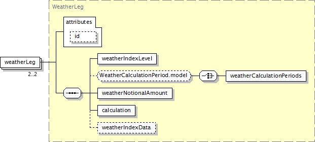 A weather leg element of a Commodity Swap defines Weather Index Swap transactions. Weather Index Swap transactions are OTC derivative transactions which settle financially based on an index calculated from observations of temperature, precipitation and other weather-related measurements at weather stations throughout the world. Sub-Annex C of the 2005 ISDA Commodity Definitions provides definitions and terms for a number of types of weather indices. These indices include: HDD (heating degree days), CDD (cooling degree days), CPD (critical precipitation days). Weather Index Swap transactions result in a cash flow to one of the two counterparties each Calculation Period depending on the relationship between the Settlement Level and the Weather Index Level. A Weather Index swap transaction always consists of a commodity swap element as a parent to two weatherLeg elements.