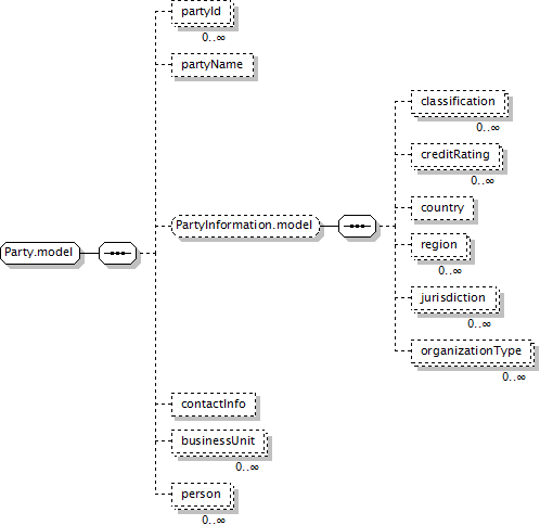 partyId*, partyName?, (classification*, creditRating*, country?, region*, jurisdiction*, organizationType*)?, contactInfo?, businessUnit*, person* |